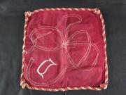 A red pillow case with red and white braided trim. The pillow case is embroidered with a white "D" and a bow on the front. On the back, the word "Dickinson" is embroidered in white. This object belonged to and was made by Ethelyn Hardesty, who gave it as a present to her husband, Clarence G. Cleaver, class of 1894.