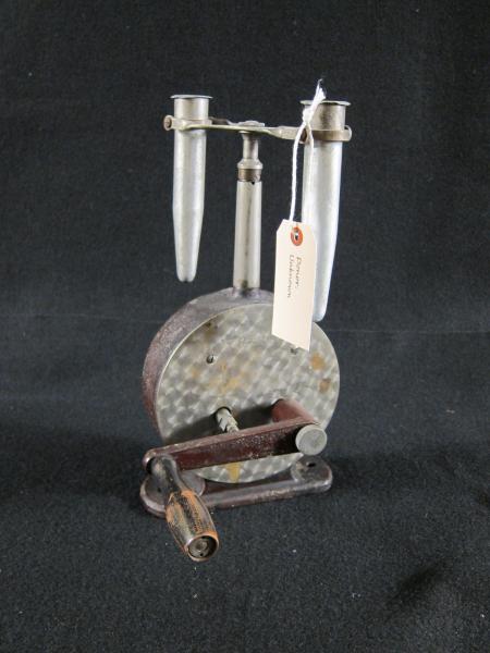 Glass tubes suspended by a metal bar attached to a circular base with a hand crank to turn them.