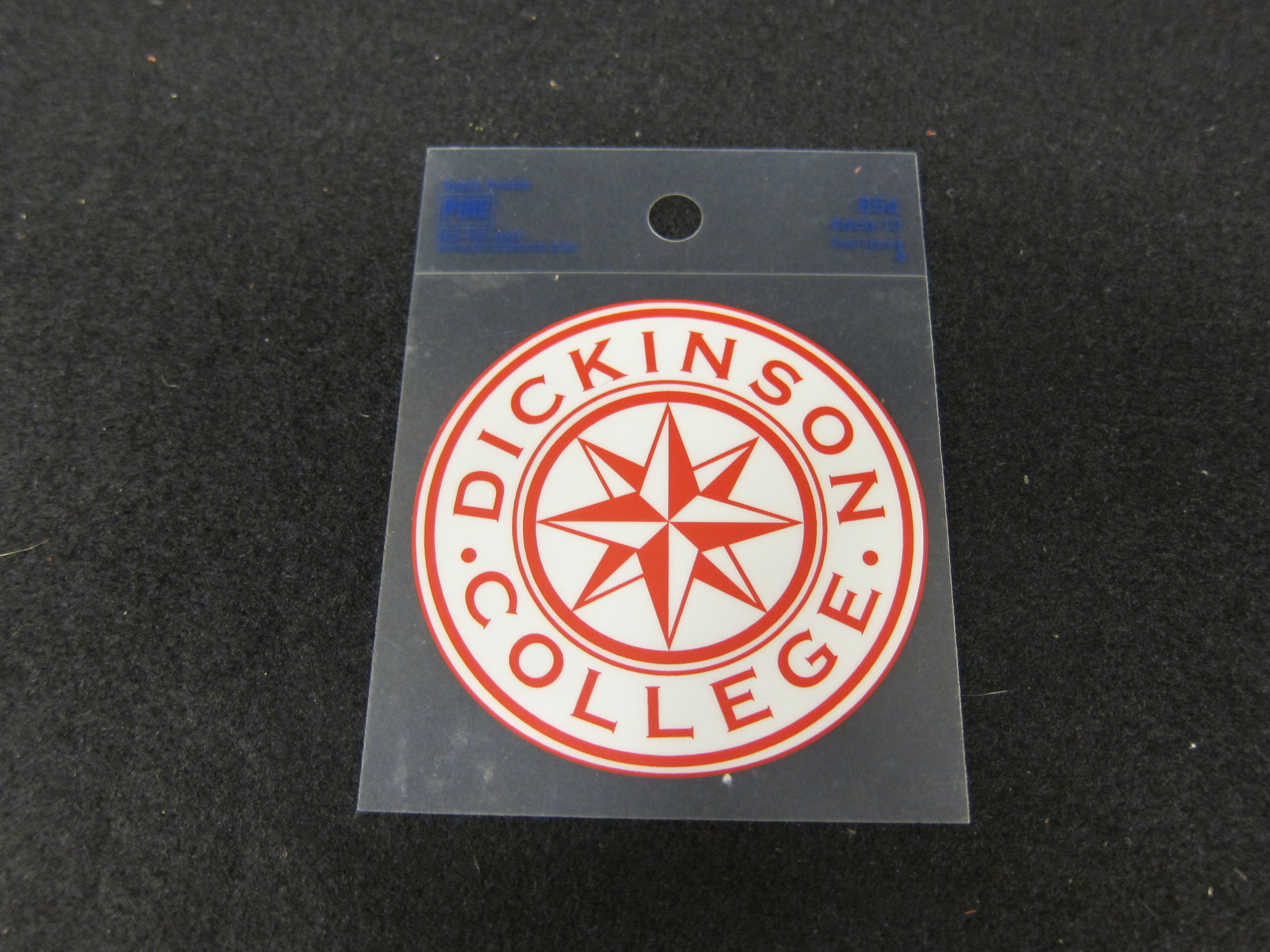 Clear, square decal with compass seal printed in red and white.
