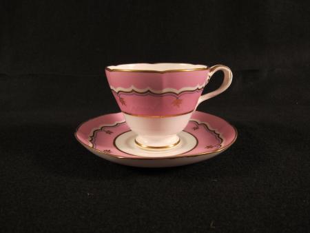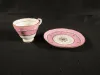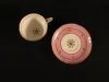 A set of five white and pink china teacups and saucers with gold gilt detail. President James Buchanan used this set while in office at the White House.