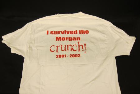 A white T-Shirt, size XL, with the Dickinson compass seal in red on the upper left corner of the chest. On the back "I survived the Morgan Crunch! 2001-2002" is printed in red.