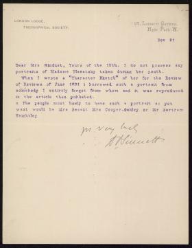 Alfred Sinnett responds to Mrs. Esther Windust's question regarding a portrait of Madame Blavatsky. While he does "not possess any portraits of Madame Blavatsky taken during her youth," Sinnett suggests that Annie Besant, Bertram Keightley, and Mrs. Cooper-Oakley are "the people most likely to have such a portrait."