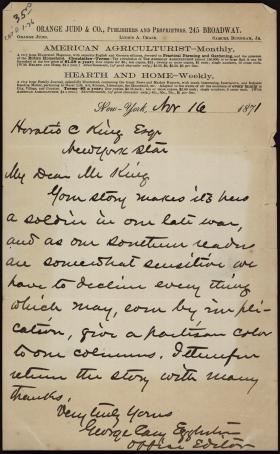 George Cary Eggleston, the editor of Hearth and Home, warns Horatio Collins King that a "story" he submitted may imply partisanship - a sensitive topic following the Civil War. "We have to decline" those stories "which may, even by implication, give a partisan color to our columns," as Eggleston explains. While Eggleston was a Confederate soldier during the Civil War, King served as an officer in the Union army.