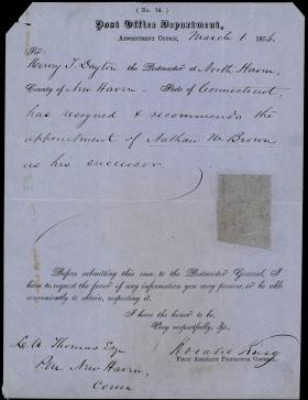Postmaster General Horatio Collins King writes to L.A. Thomas, Postmaster of New Haven, CT, about a recent position vacancy. Collins states that Hervey T. Dayton resigned from the job and recommends Nathan U. Brown as a replacement.