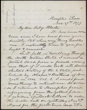 Jacob Thompson, Secretary of the Interior in President James Buchanan's administration, writes Jeremiah Sullivan Black and asks for advice on what to do about the slander in John Bonner's Child's History of the United States. Black also served in President Buchanan's administration as Attorney General and later as Secretary of State.