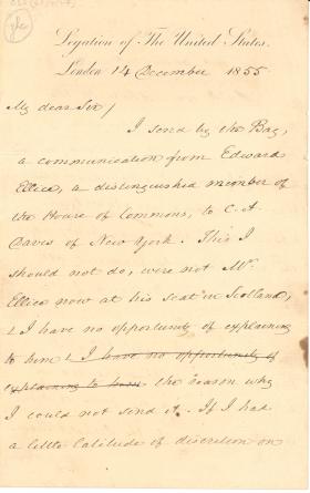 James Buchanan, the United States Minister to the United Kingdom, writes to W. Hunter and encloses a communication of "an important religious subject" from Edward Ellice, a member of the House of Commons, to C. A. Davis of New York. Transcript included.