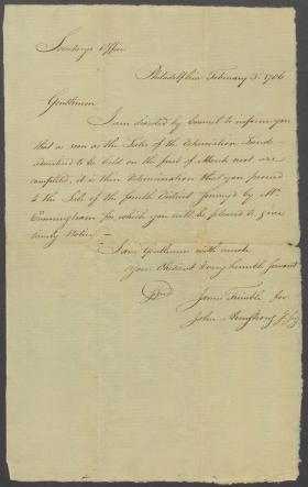 John Armstrong, Jr. writes to the Secretary's Office about the notice of sale of lands in the fourth district surveyed by Mr. Cunningham. James Trimble signs the document for Armstrong. Transcript included.