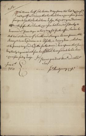 Captain John Montgomery writes Richard Peters to recommend John Hadden for a commission as ensign. Montgomery explains that his “Company are Desireous that no other person should have the commission but [Hadden].” Transcript included.