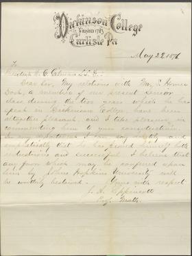Professor Joshua Lippincott writes Daniel Gilman, President of Johns Hopkins University, in order to recommend S. Homer Dosh, a senior at Dickinson, for a program at that institution. "[Dosh] has proved himself both industrious and successful" at Dickinson, as Lippincott explains. Transcript included.