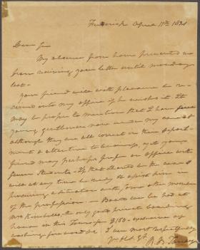 Attorney Roger Brooke Taney writes to another lawyer, J. Meredith, and agrees to accept Meredith's friends as a student in his law office. "Your friend will with pleasure be received into my office if he wishes it," as Taney notes. Taney also recommends "Mrs. Kimballs" as "the only good private boarding house in this Town."