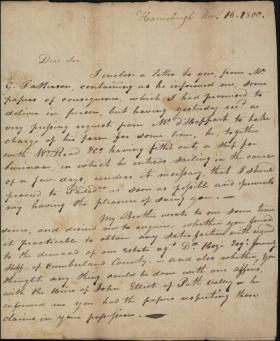 William A. Thompson writes to James Hamilton and informs him that he must proceed to Philadelphia "to take charge of [St. Leger D'Happart's] farm" and will be unable to visit as a result. Thompson also asks for legal advice on pursuing several claims and notes that a letter with "papers of consequence" for Hamilton from a G. Patterson is enclosed.