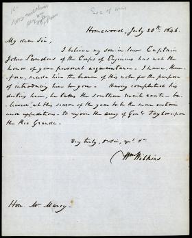 William Wilkins, Secretary of War from 1844-45, writes to his successor William Marcy. Wilkins introduces his son in law, Captain John Sanders of the Corps of Engineers. Sanders will take the southern mail route to rejoin General Zachary Taylor at the Rio Grande. Transcript included.