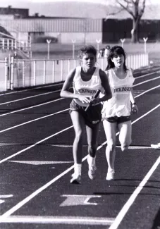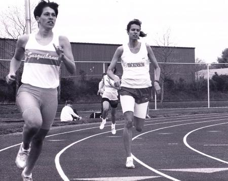 Dickinson runners in a relay complete a handoff of their baton during a track meet in 1989.