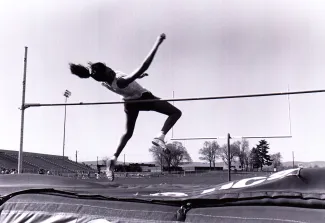 Members of the Women's Track team pose for a photograph on the high jump pit in 1990.