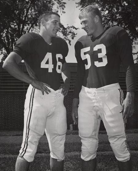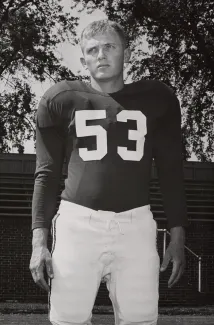View of John Rogers (Class of 1959) in his football uniform. Rogers is wearing #53.