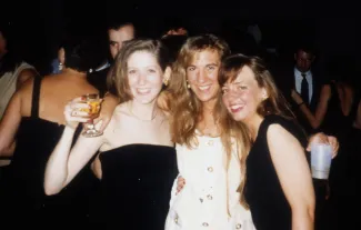 Four friends from the Class of 1993 smile during a Dickinson football game at Biddle field.