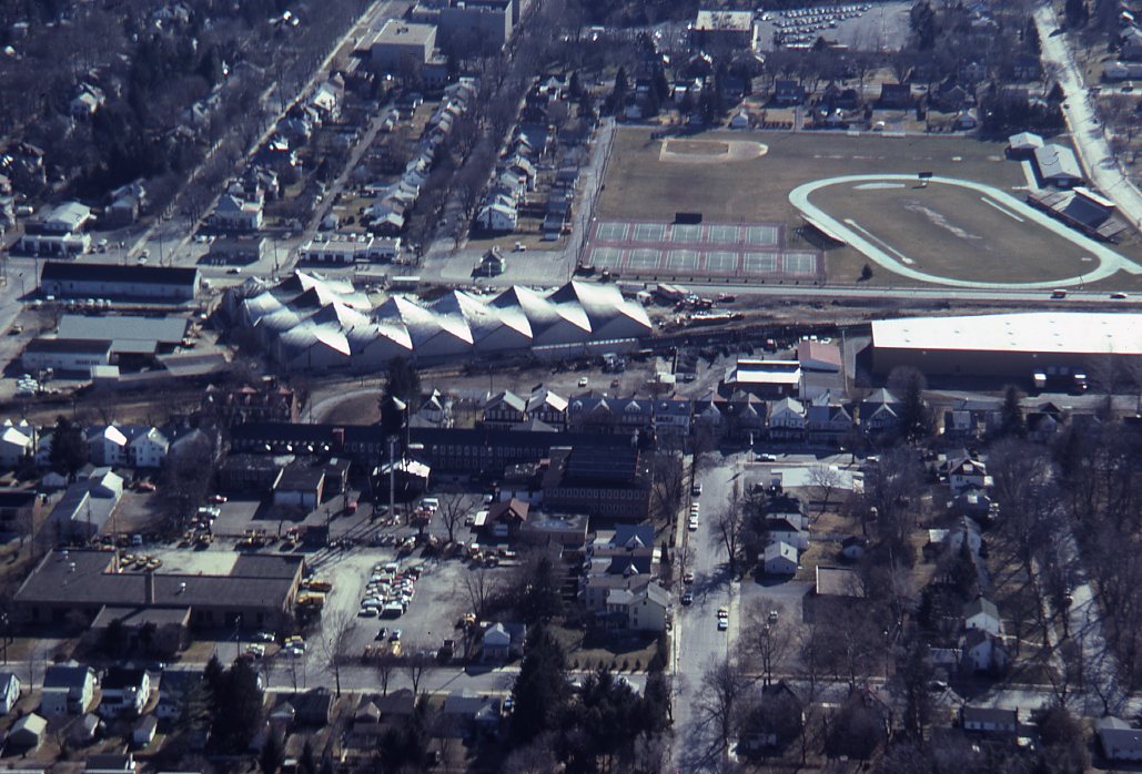 Aerial view of campus athletic facilities, including the Kline Center and Biddle Field in February 1980. The Kline Center, which is under construction at this time, would open in the fall.