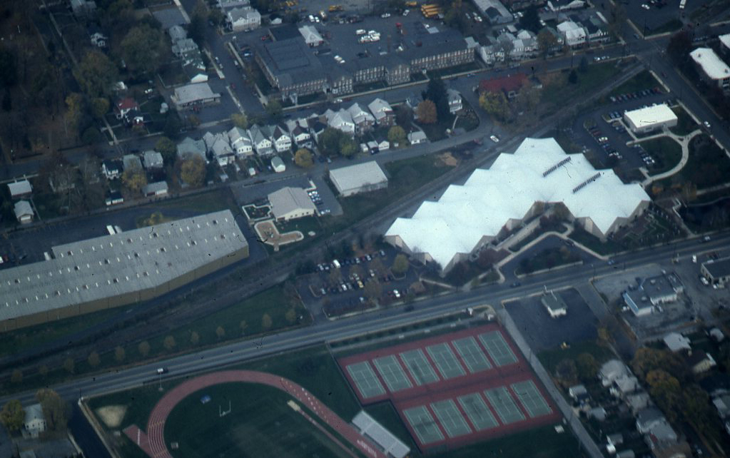 Aerial view of campus athletic facilities, including the Kline Center and Biddle Field, in November 1993.