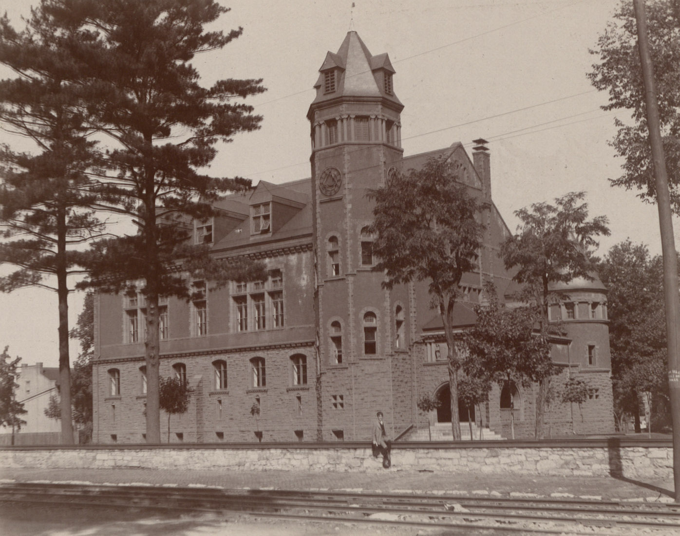 View of Bosler Hall from W. High Street around 1900. The railroad tracks on W. High Street are visible in the foreground. Location Photograph Archives Format Photographic Print, B&W Decade 1900-1909 Places Bosler Hall