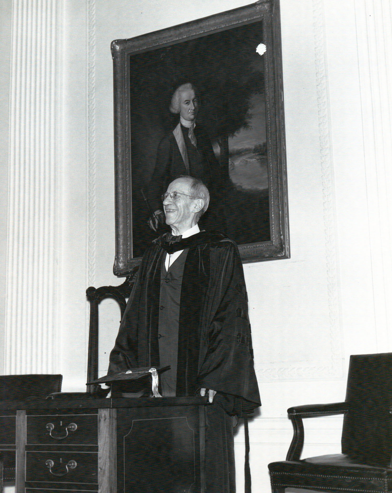 View of trustee Boyd Lee Spahr (Class of 1900) standing under the portrait of John Dickinson at an event around 1960. Location Photograph Archives Format Photographic Print, B&W Decade 1960-1969 Roles Alumni Trustee People Spahr, Boyd Lee