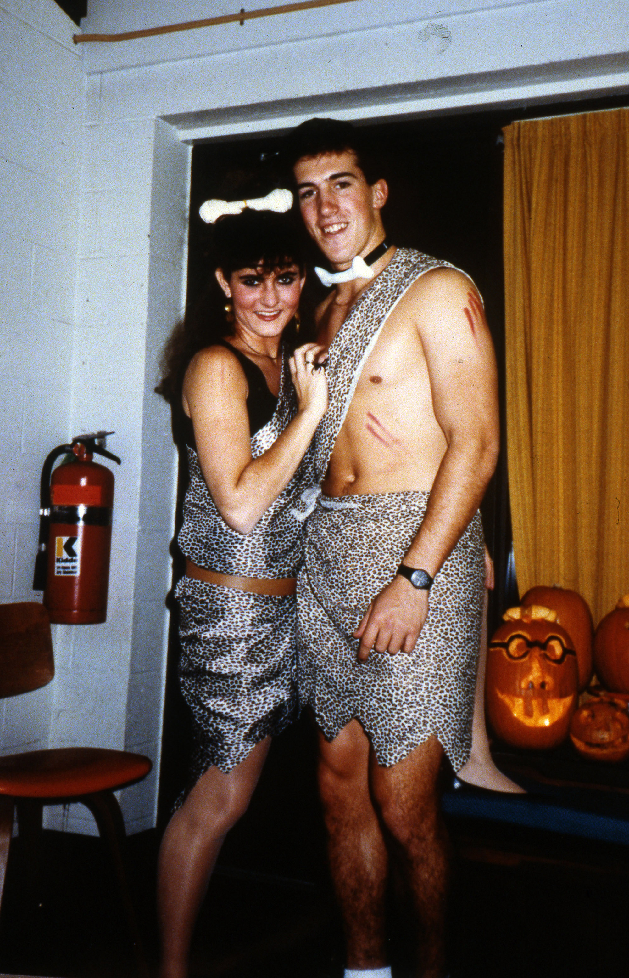 Mimi Azoubel (class of 1989) stands with another student in cavemen costumes for Halloween.