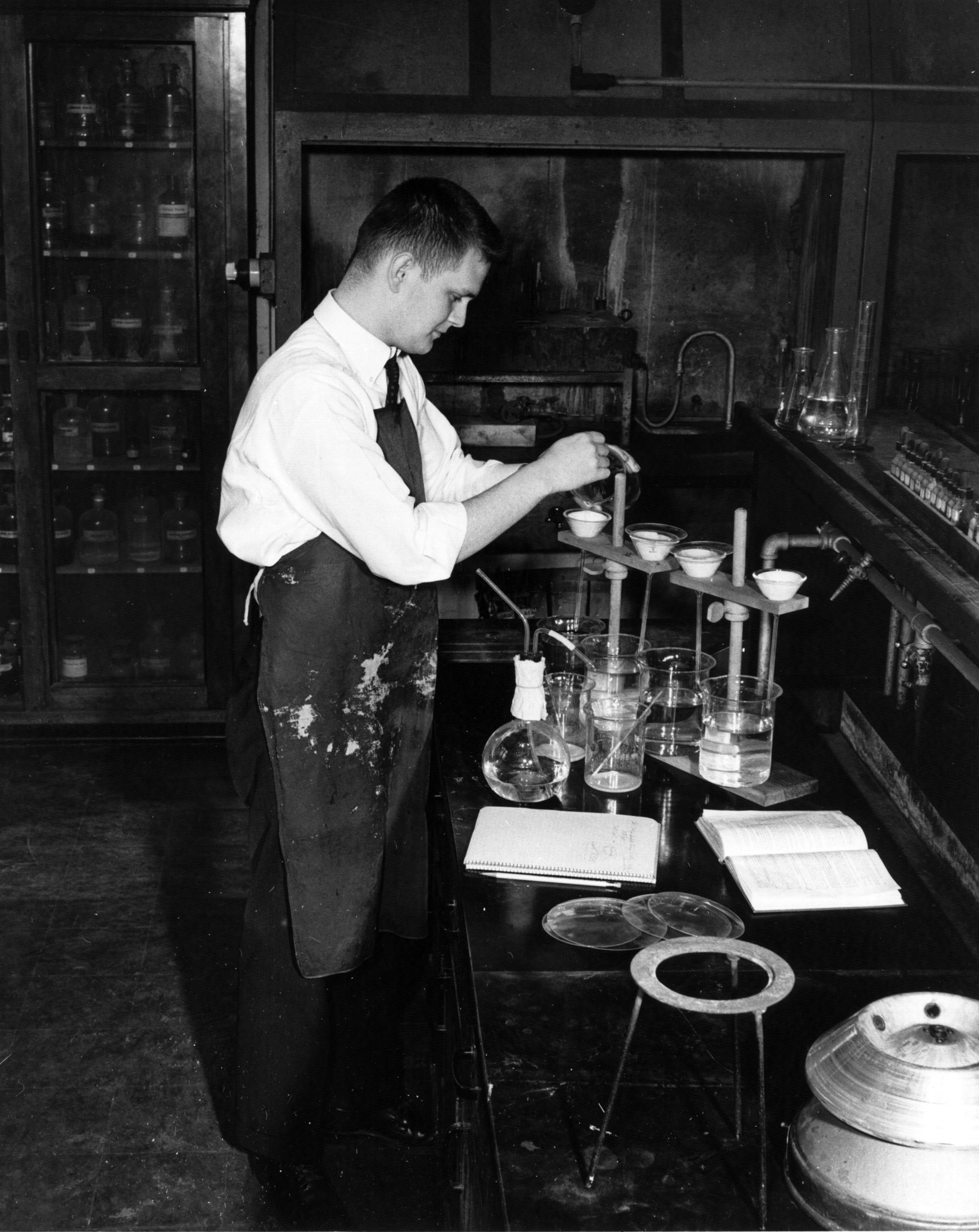 A student pours a reagent into a beaker in a chemistry lab exercise around 1955.