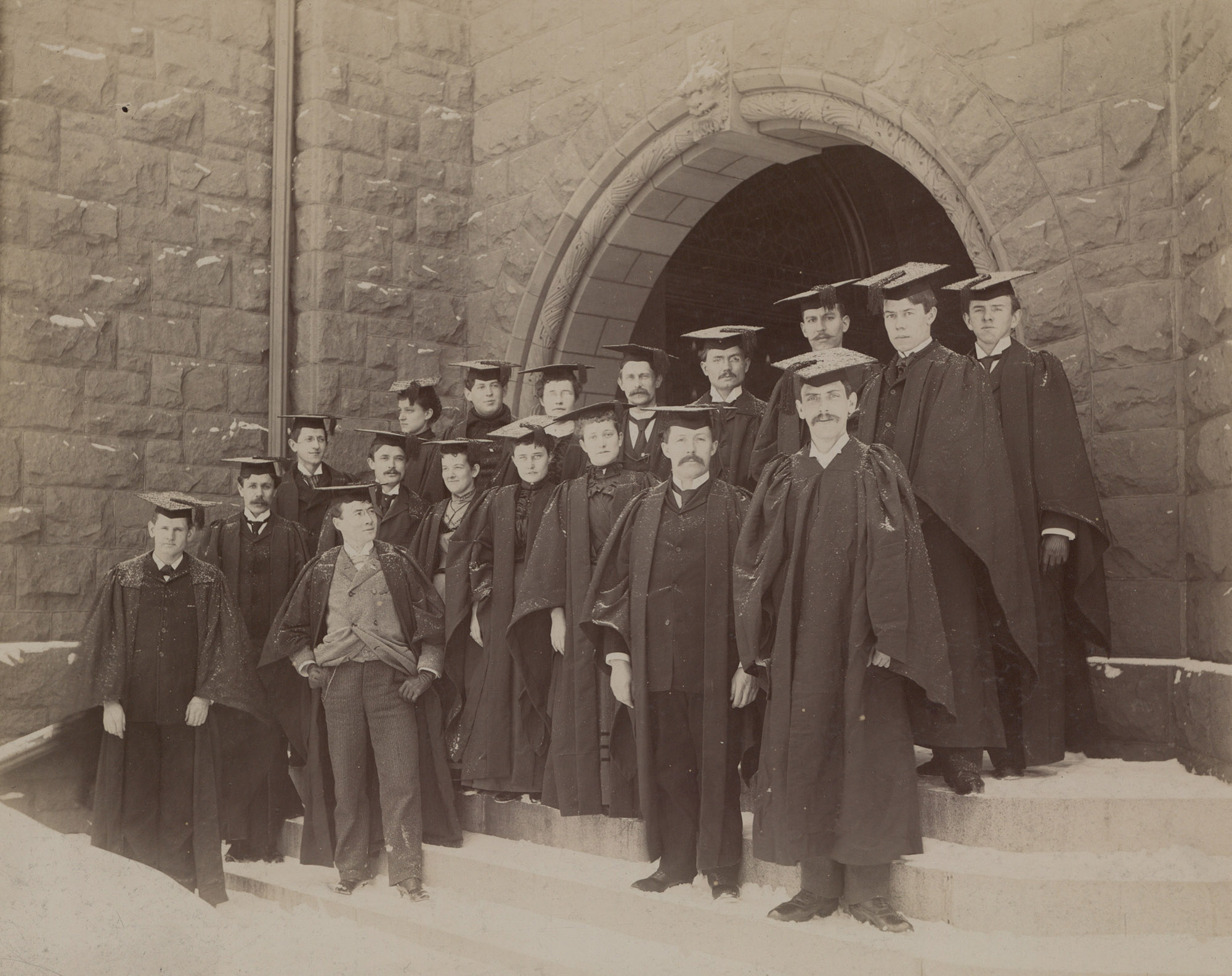 The Class of 1895 stand on the Bosler Hall steps in their caps and gowns in the snow.
