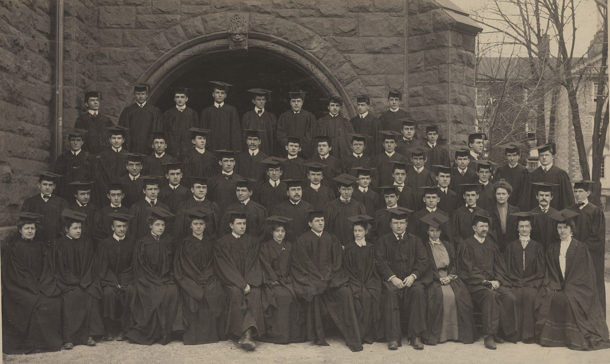The Class of 1902 outside of Bosler Hall in their caps and gowns in spring 1902.