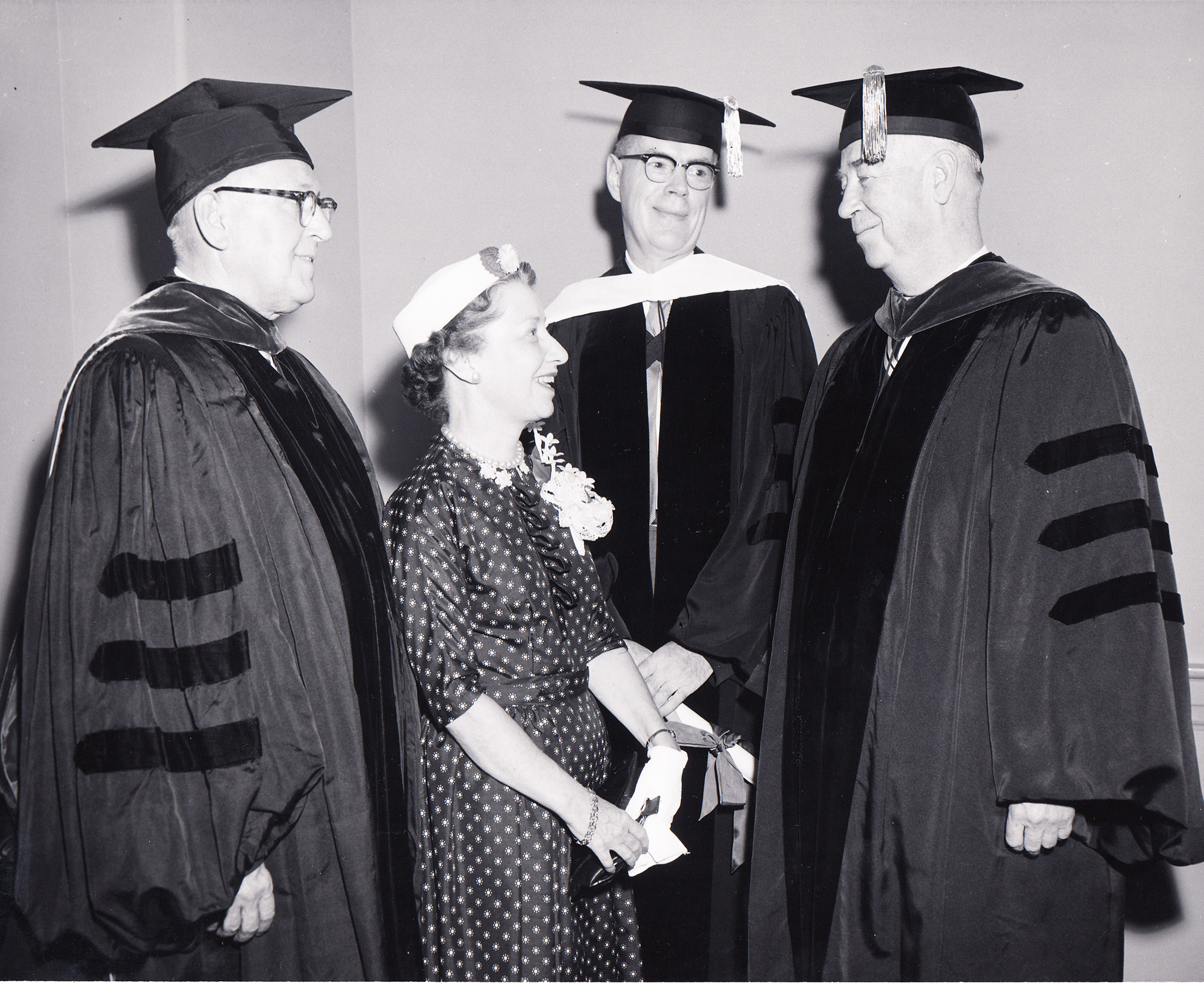 A group standing at Commencement on June 2, 1957 and the man in the center is identified as Charles C. Sellers.