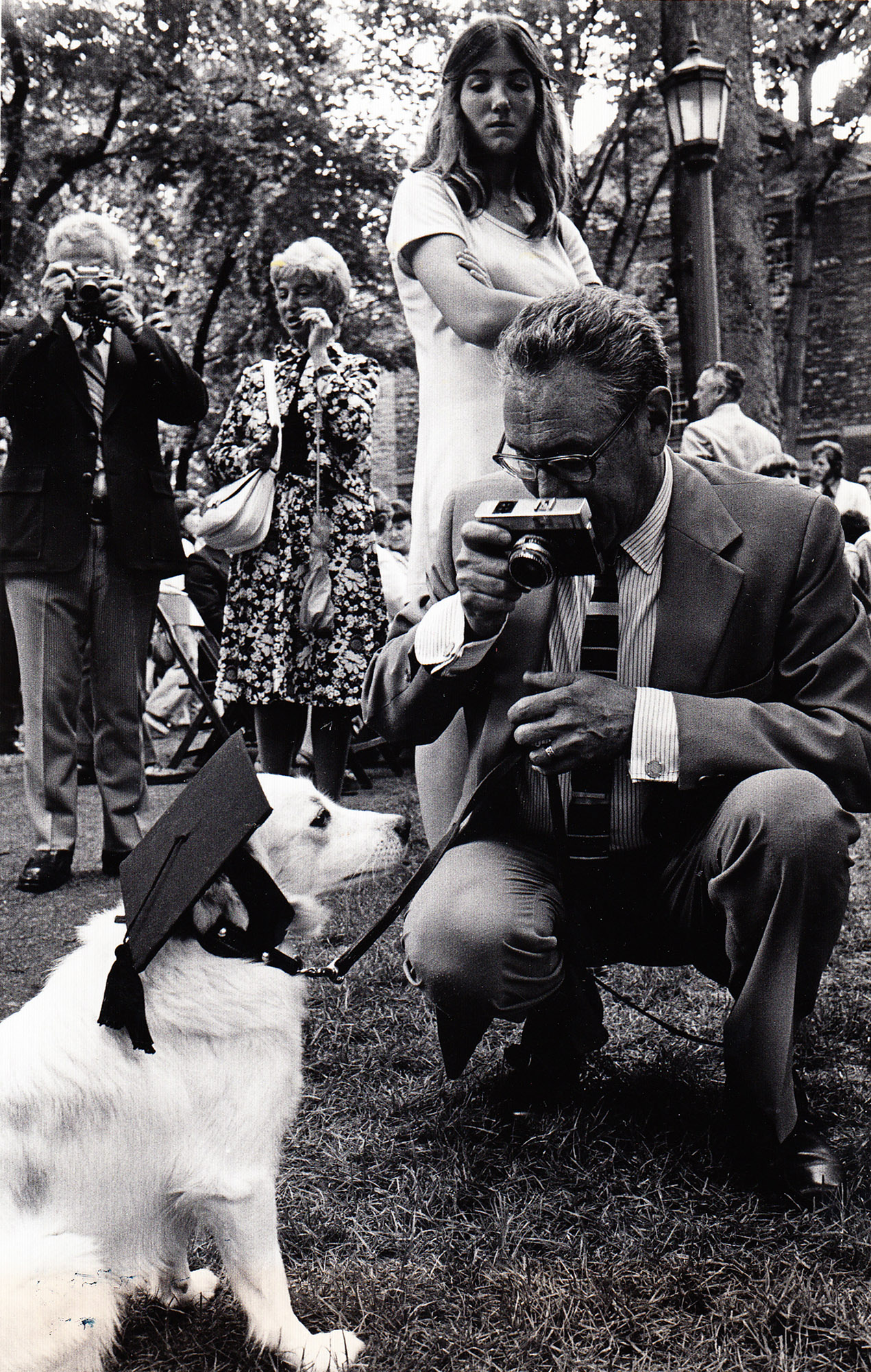 A man takes a picture of a dog wearing a small cap at Commencement on May 18, 1980.