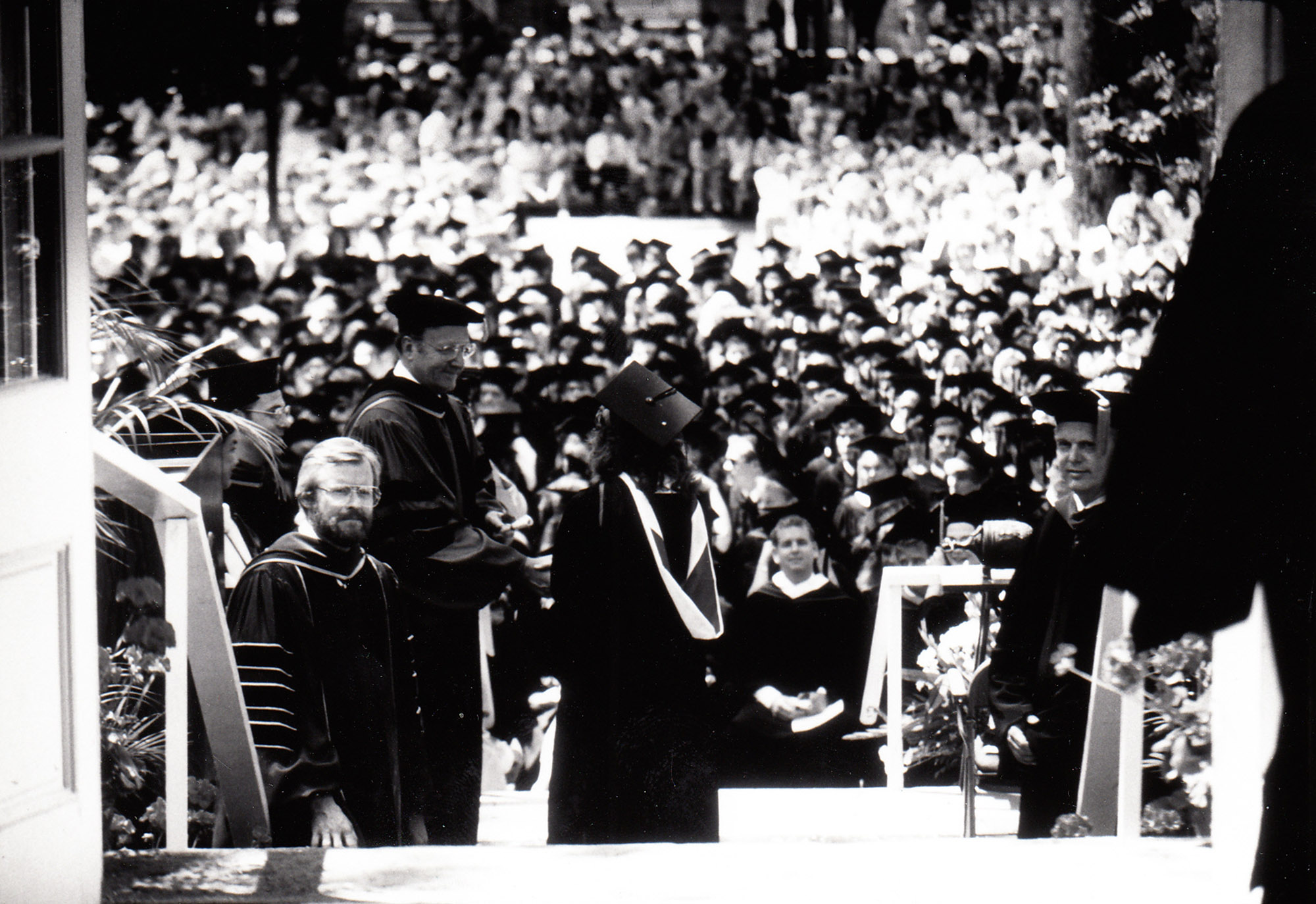 from the doorway of Old West as President A. Lee Fritschler hands a diploma to a student during Commencement on May 21, 1989.