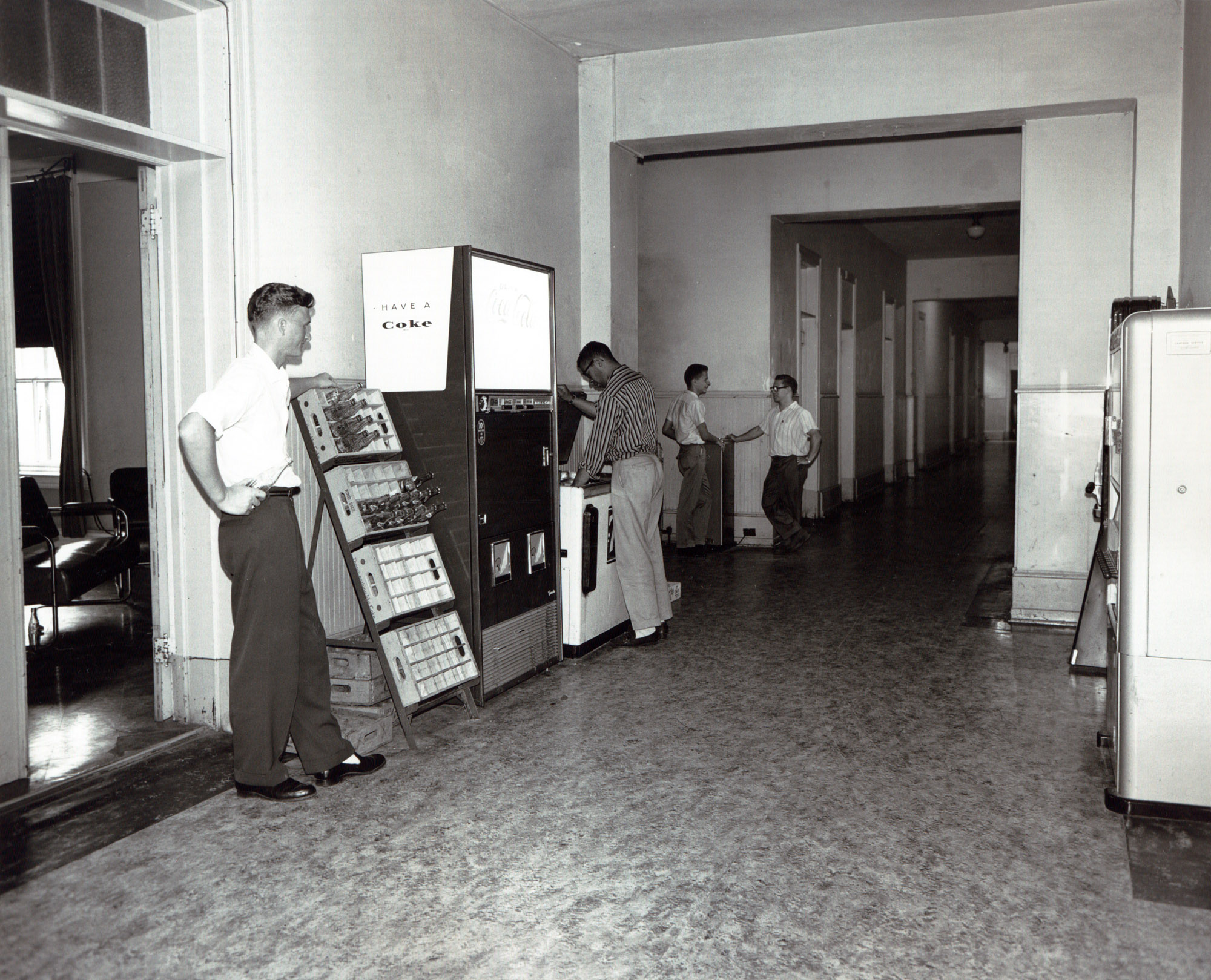 Students standing in a hallway in Conway Hall around 1960. Fred Morsell is the student standing to the left of the Coke machine.