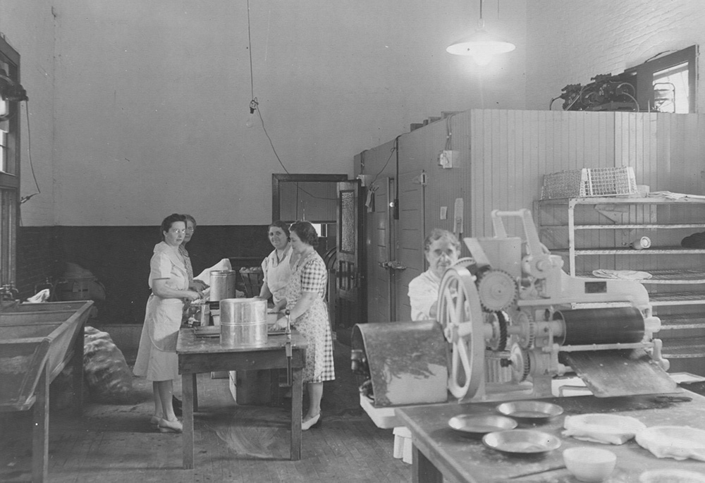 Several women prepare meals in the Mess hall kitchen for the 32nd Army Air Corps cadets in 1944.