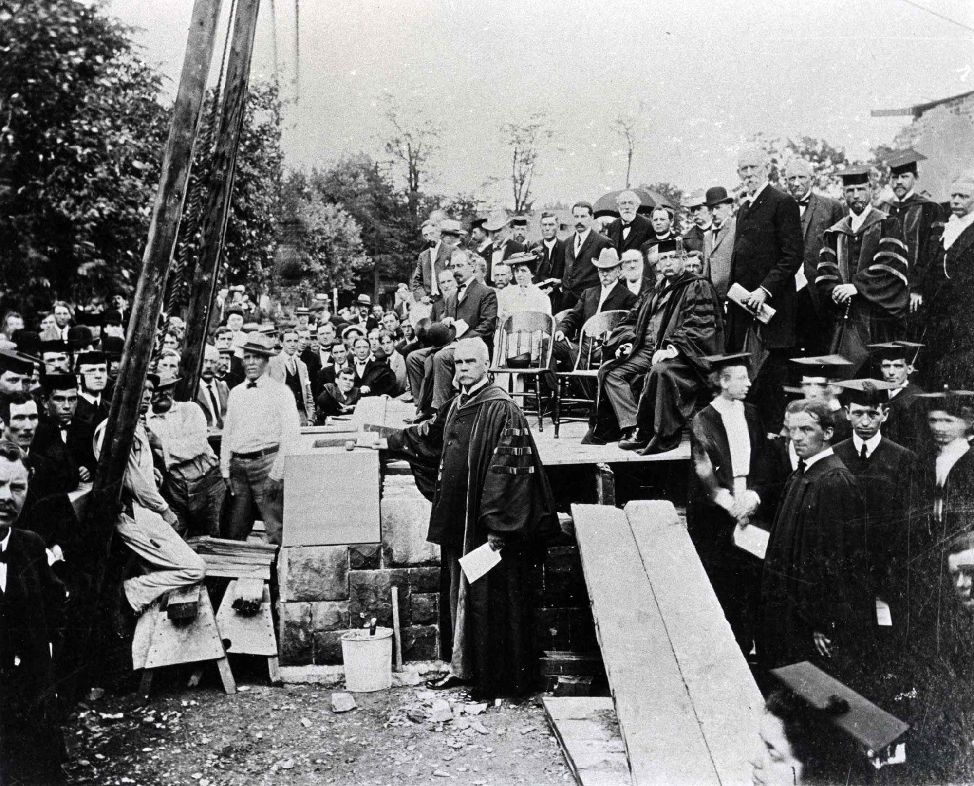 Students and faculty at the cornerstone laying ceremony for Denny Hall on June 7, 1904. President George E. Reed is standing next to the cornerstone and Horatio Collins King ('58) is sitting on the stage.