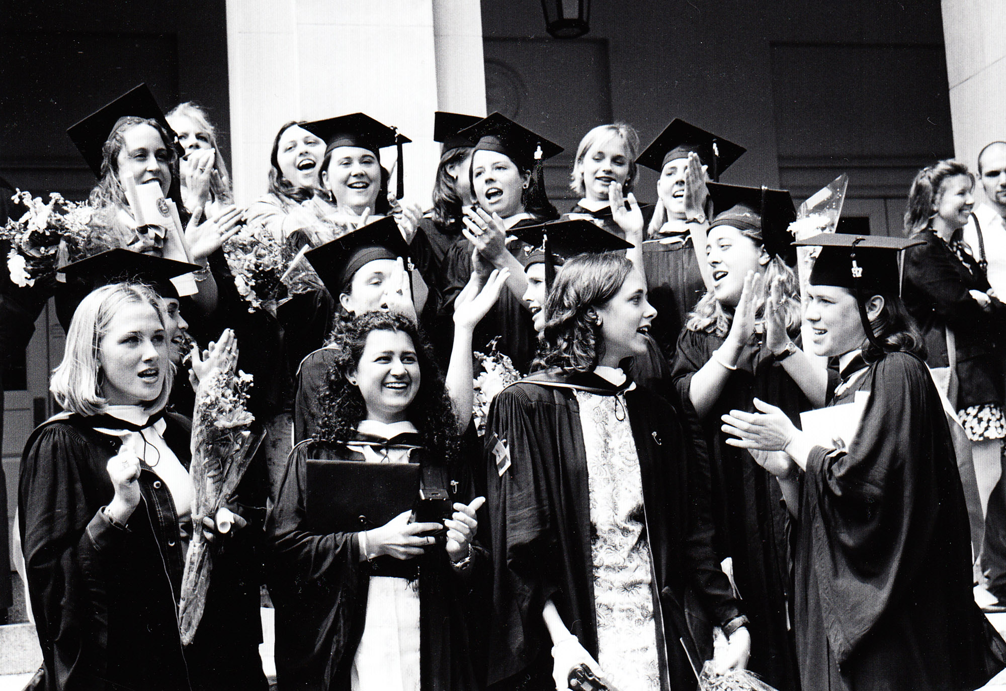 A group of Delta Nu sisters stand in front of Bosler Hall at Commencement on May 18, 1997.
