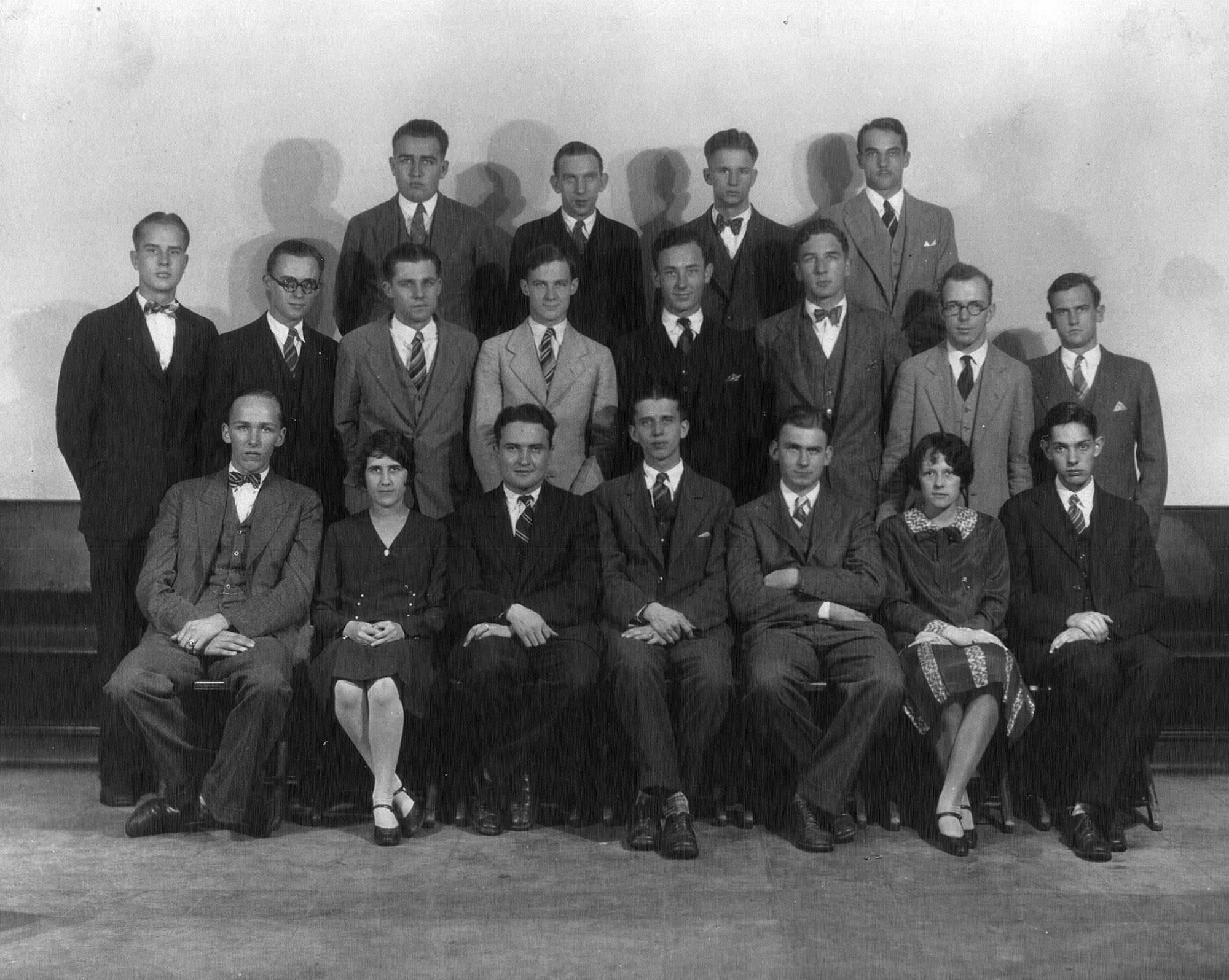 Bottom: Richard V. Zug ('28), Evelyn Learn ('29), James G. Haggerty ('28), Paul D. Olejar ('28), William R. Smith ('28), Grace E. Leach ('29), Aubrey H. Baldwin ('29)