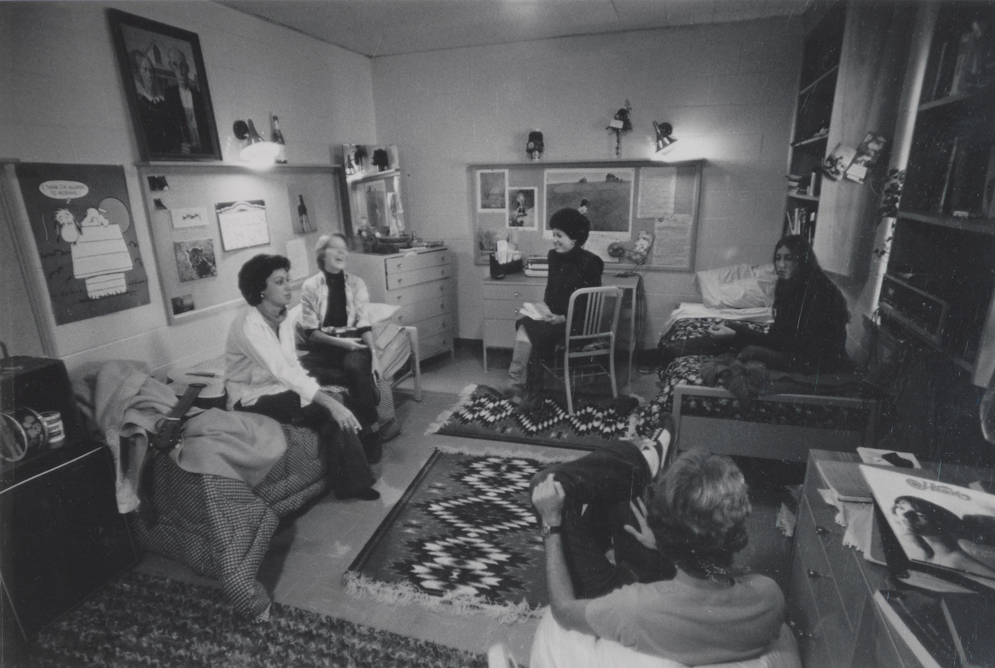 View of a group of students in a dorm room in Adams Hall around 1980.