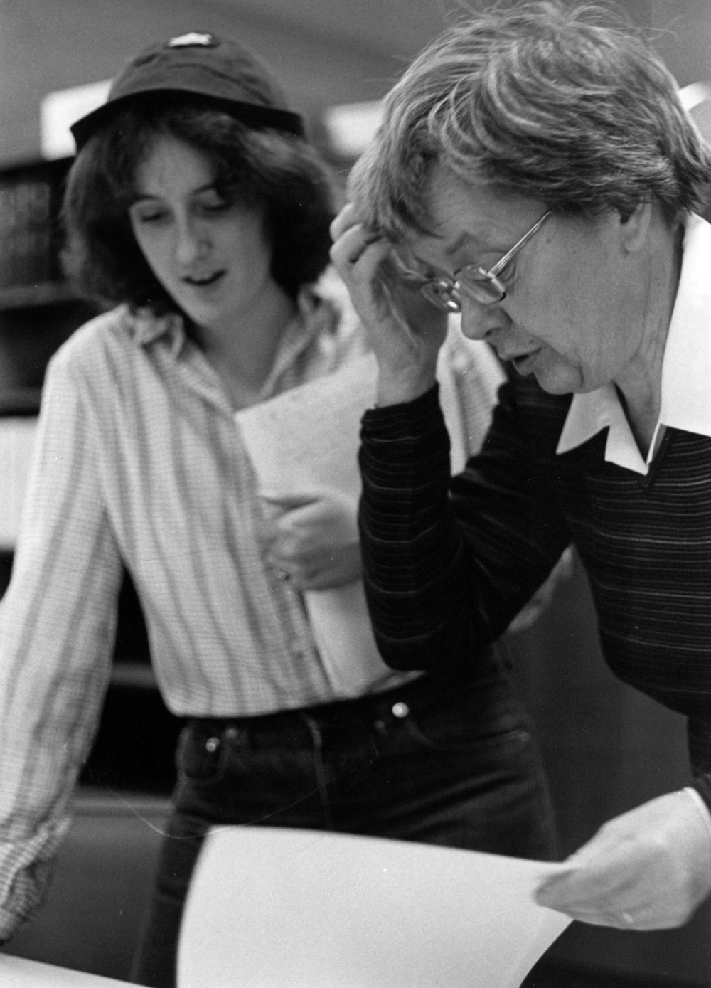 Librarian Dorothy Cieslicki helps a student. Location Photograph Archives Format Photographic Print, B&W Decade 1970-1979 Roles Faculty Students People Cieslicki, Dorothy Huffman Other Student-Faculty Interaction
