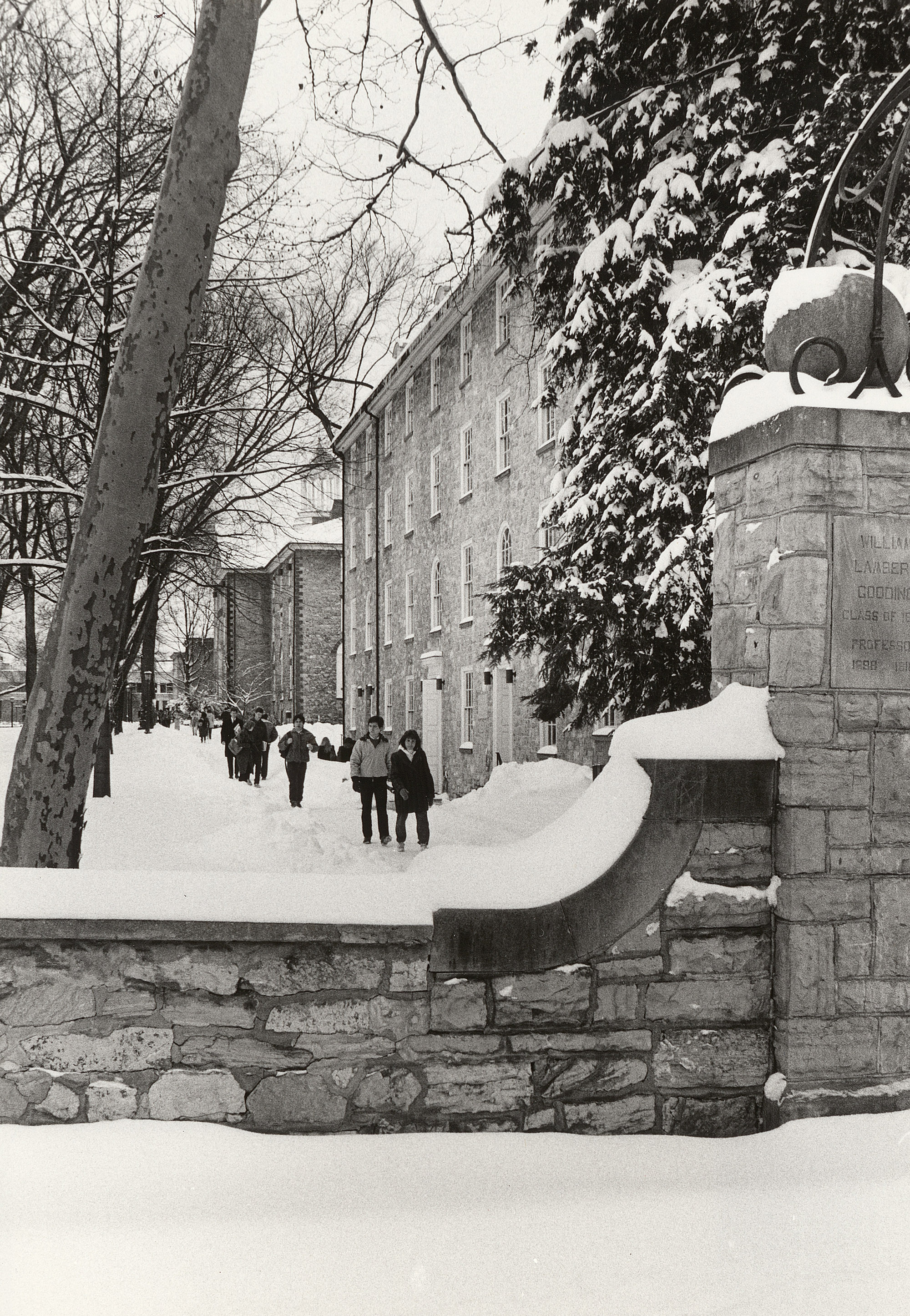 View as Dickinsonians walk by East College in the snow in 1986. Location Photograph Archives Format Photographic Print, B&W Decade 1980-1989 Places East College Roles Faculty Students Other Campus Winter Scenes