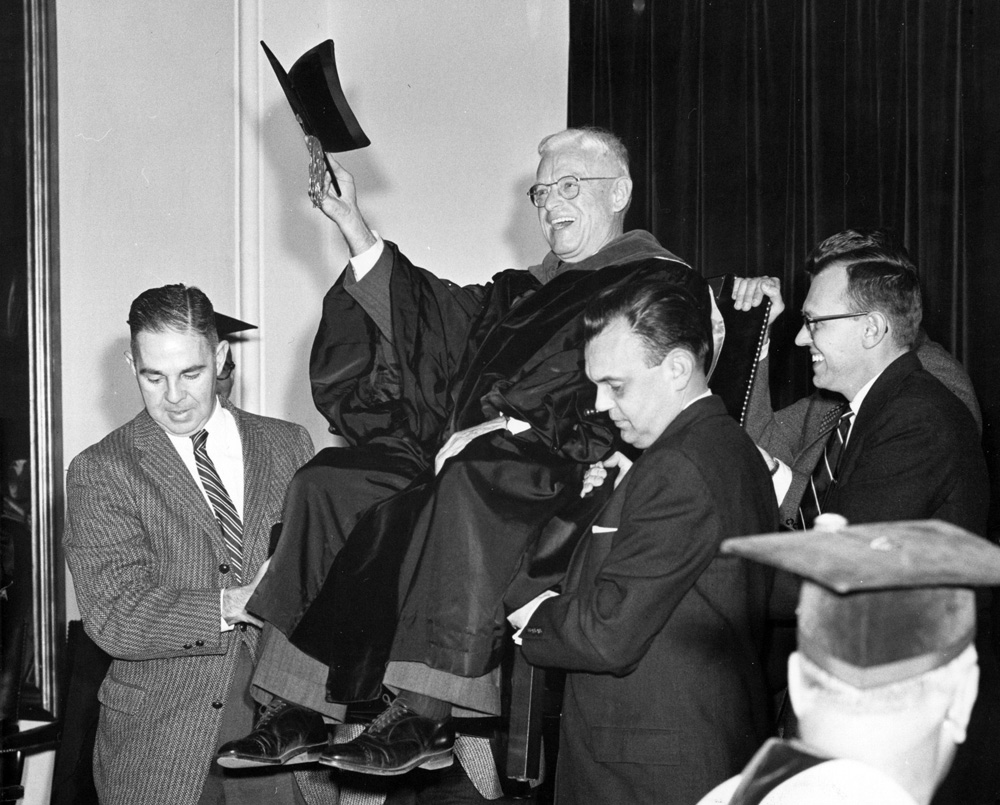 Professor Edgar Finck being carried in the Henry Ford Chair of Education which he was awarded, in February 1958.