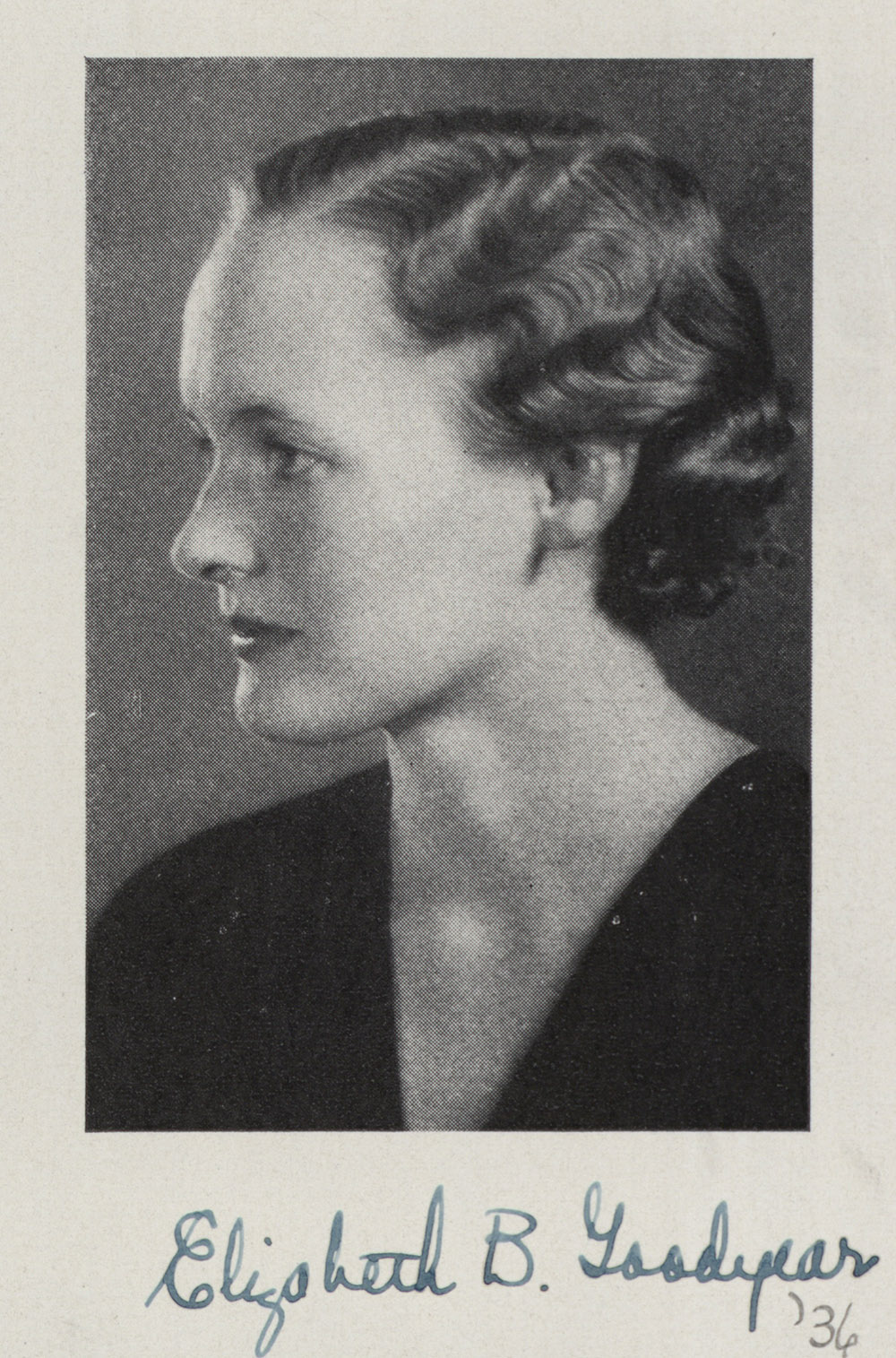 Elizabeth B. Goodyear is a member of the Class of 1936. Location Photograph Archives Format Photographic Print, B&W Decade 1930-1939 Roles Students People Goodyear, Elizabeth B.