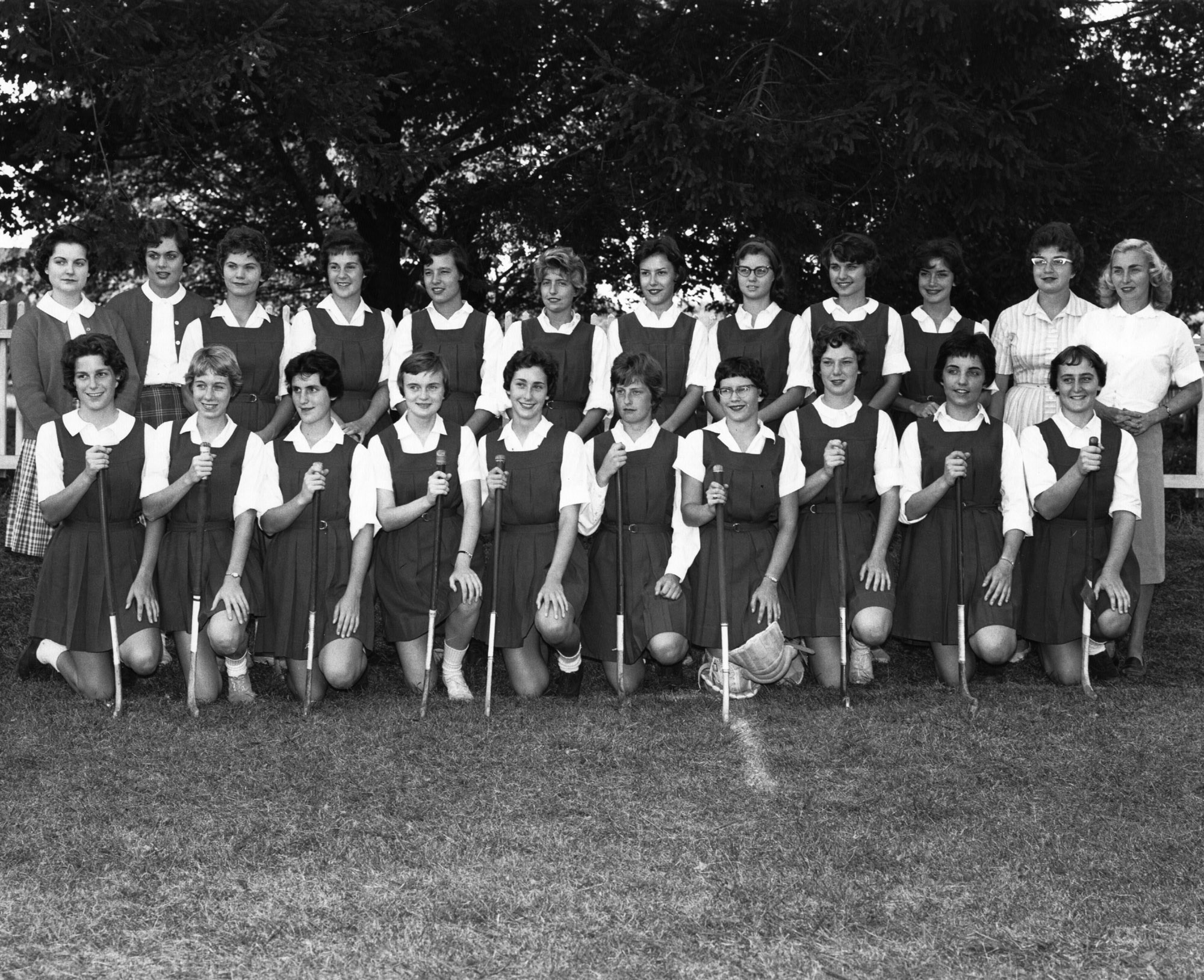 The field hockey team in 1961. Location Photograph Archives Format Photographic Print, B&W Decade 1960-1969 Athletics Field Hockey Roles Coaches Students