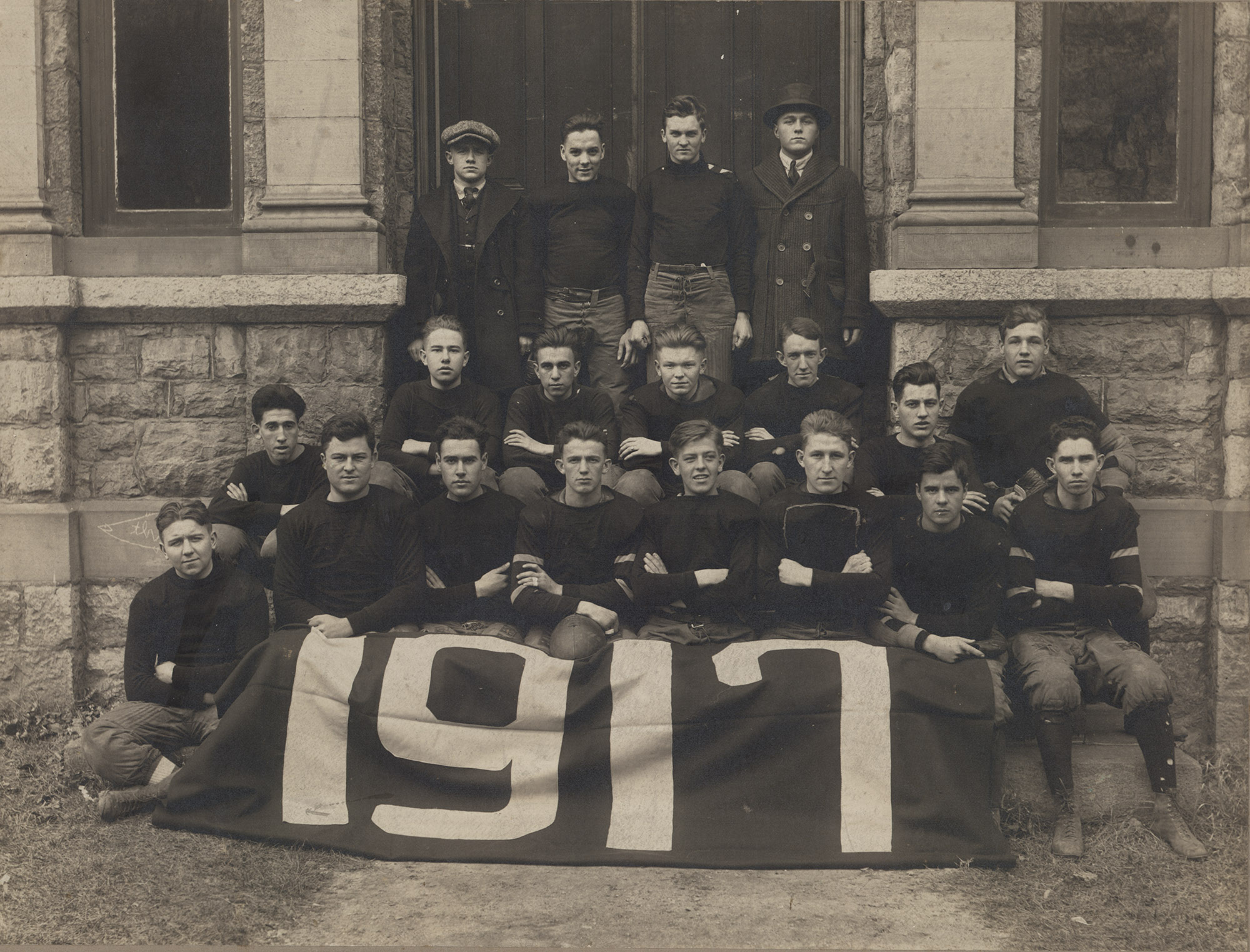 The Football team holds a "1917" banner. Photographer Hensel Studio Location Photograph Archives Format Photographic Print, B&W Decade 1910-1919 Athletics Football Roles Coaches Students