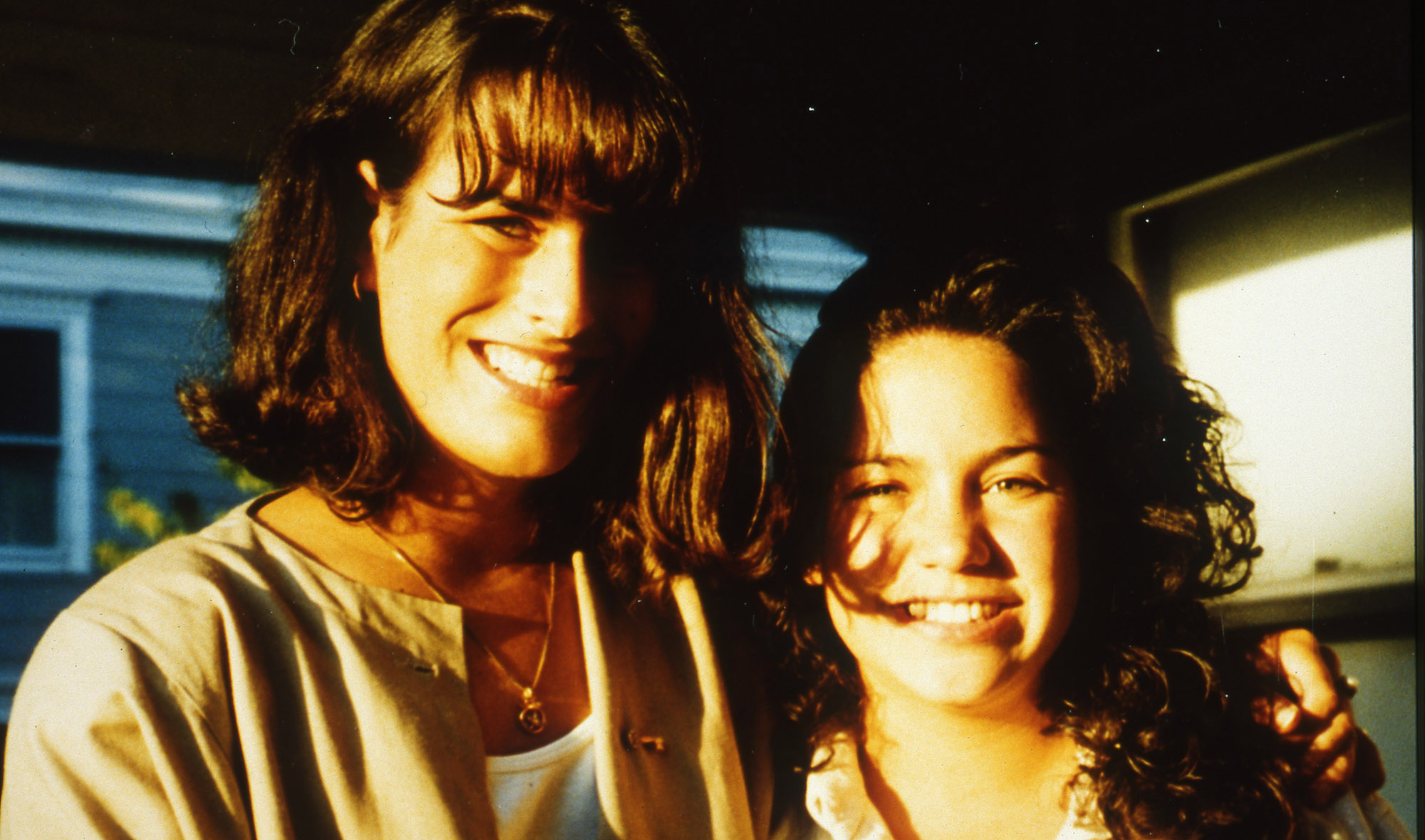 Two friends smile for the camera while the setting sun lights up their faces.