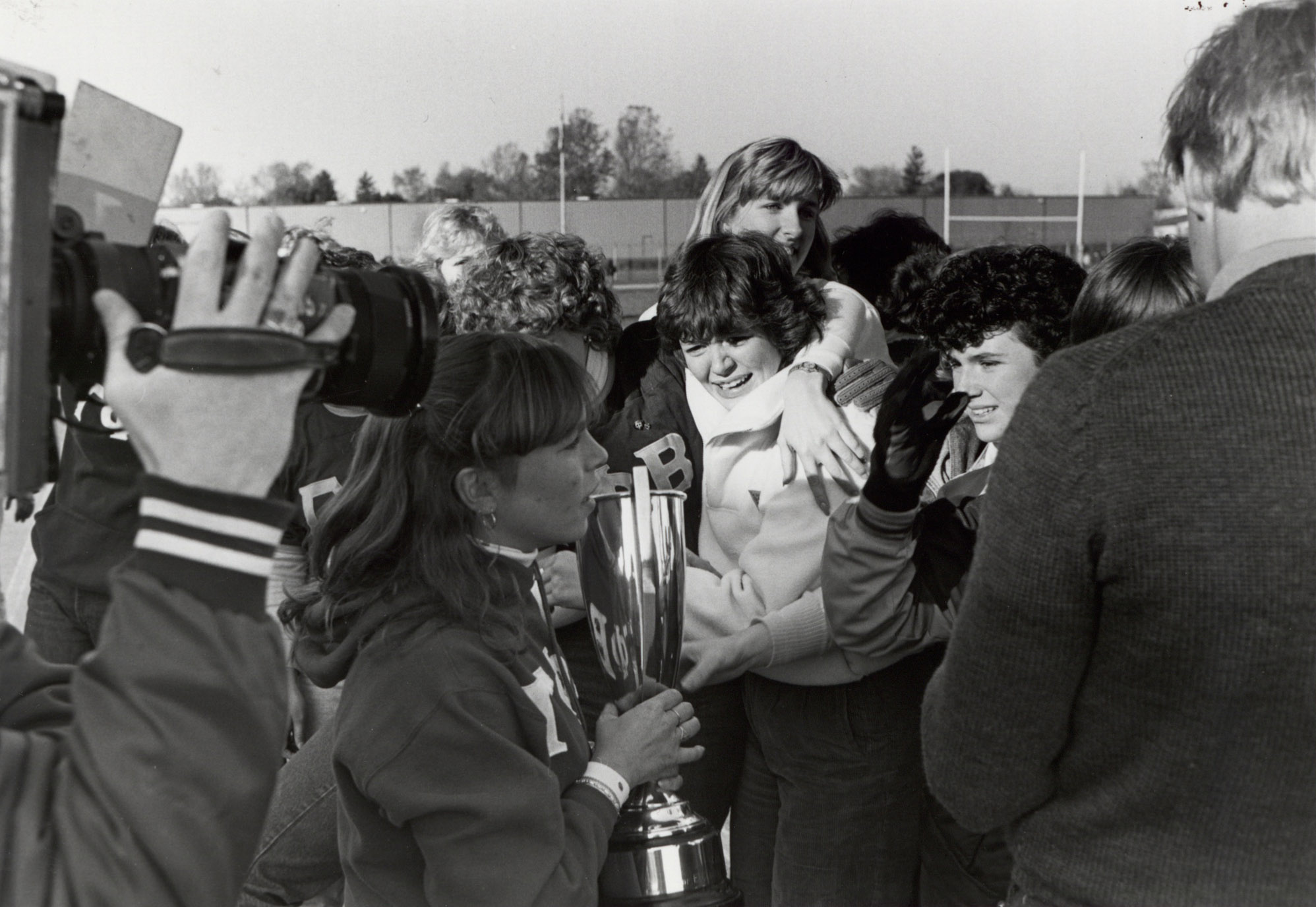 Gamma Phi Beta sisters celebrate after receiving the President's Cup at the Homecoming football game on November 5, 1984.