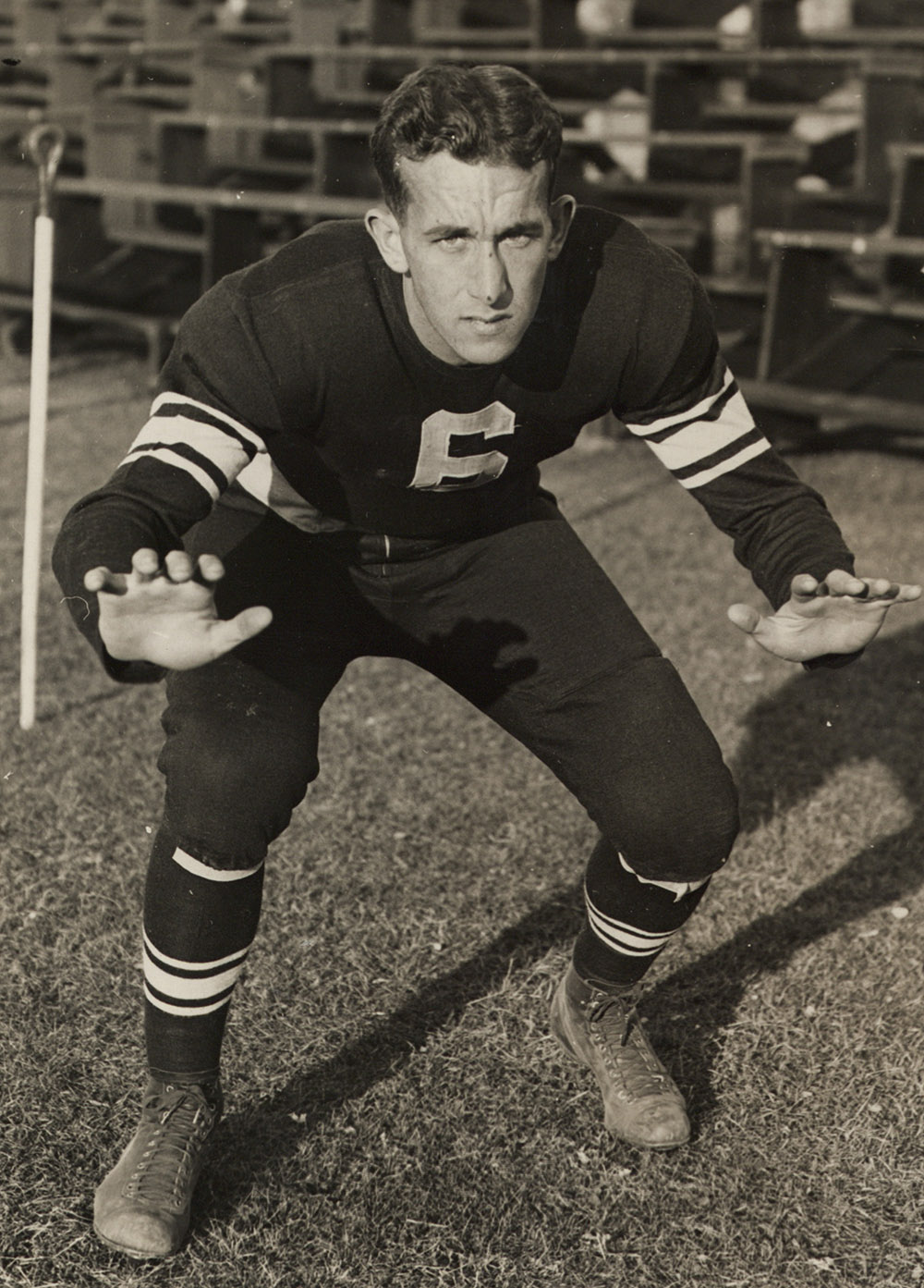 View of George Shuman Jr. (Class of 1937) in his football uniform. Location Photograph Archives Format Photographic Print, B&W Decade 1930-1939 Roles Students People Shuman, George (Jr.)