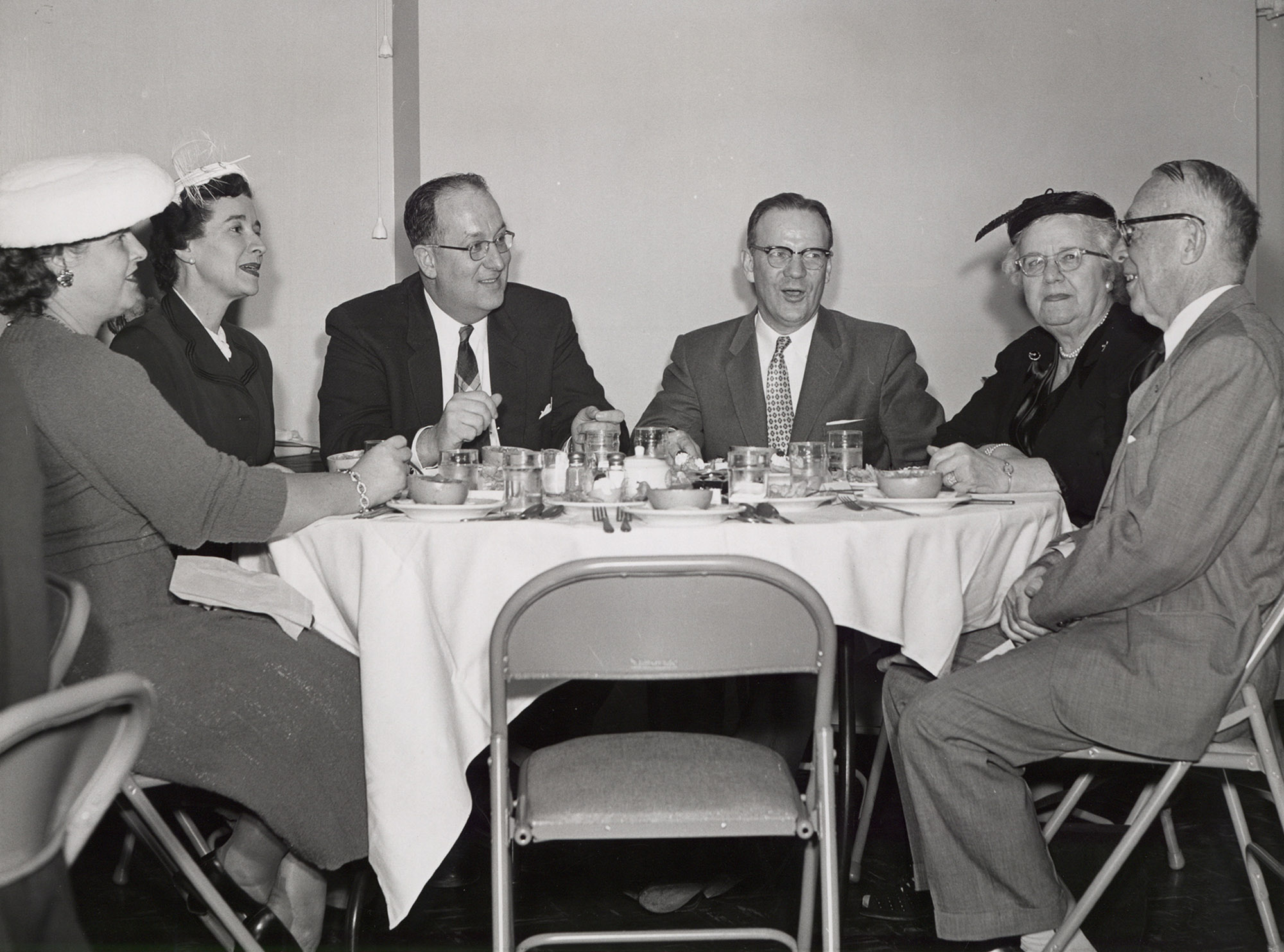 View of trustee George Shuman Jr. (Class of 1937) at an event around 1960. Shuman is third from left. Location Photograph Archives Format Photographic Print, B&W Decade 1960-1969 Roles Alumni Trustee People Shuman, George (Jr.)