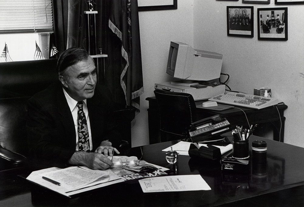 View of Representative George William Gekas (Class of 1952) in his office around 1990. A copy of the Dickinson Magazine is on his desk.