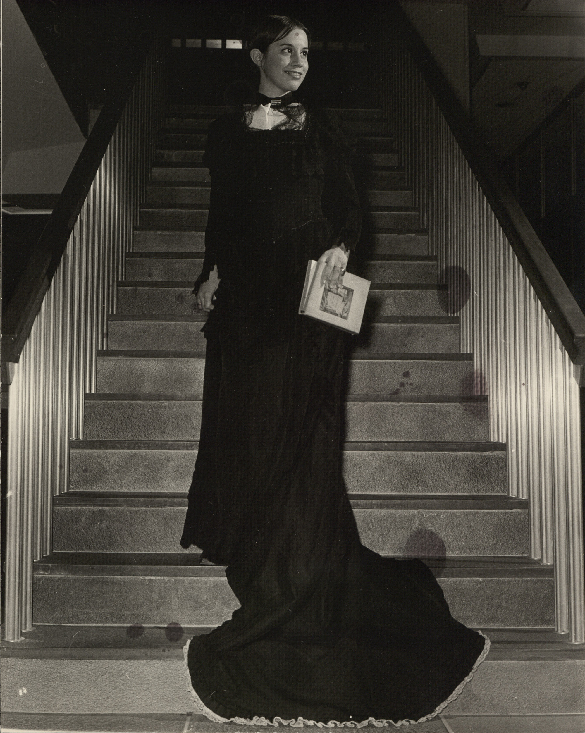 Jane Kohhaus, 1968 Homecoming Queen, models Zatae Longsdorff's dress on the stairs in Spahr Library. Longsdorff, a member of the Class of 1887, was first female graduate of the College.
