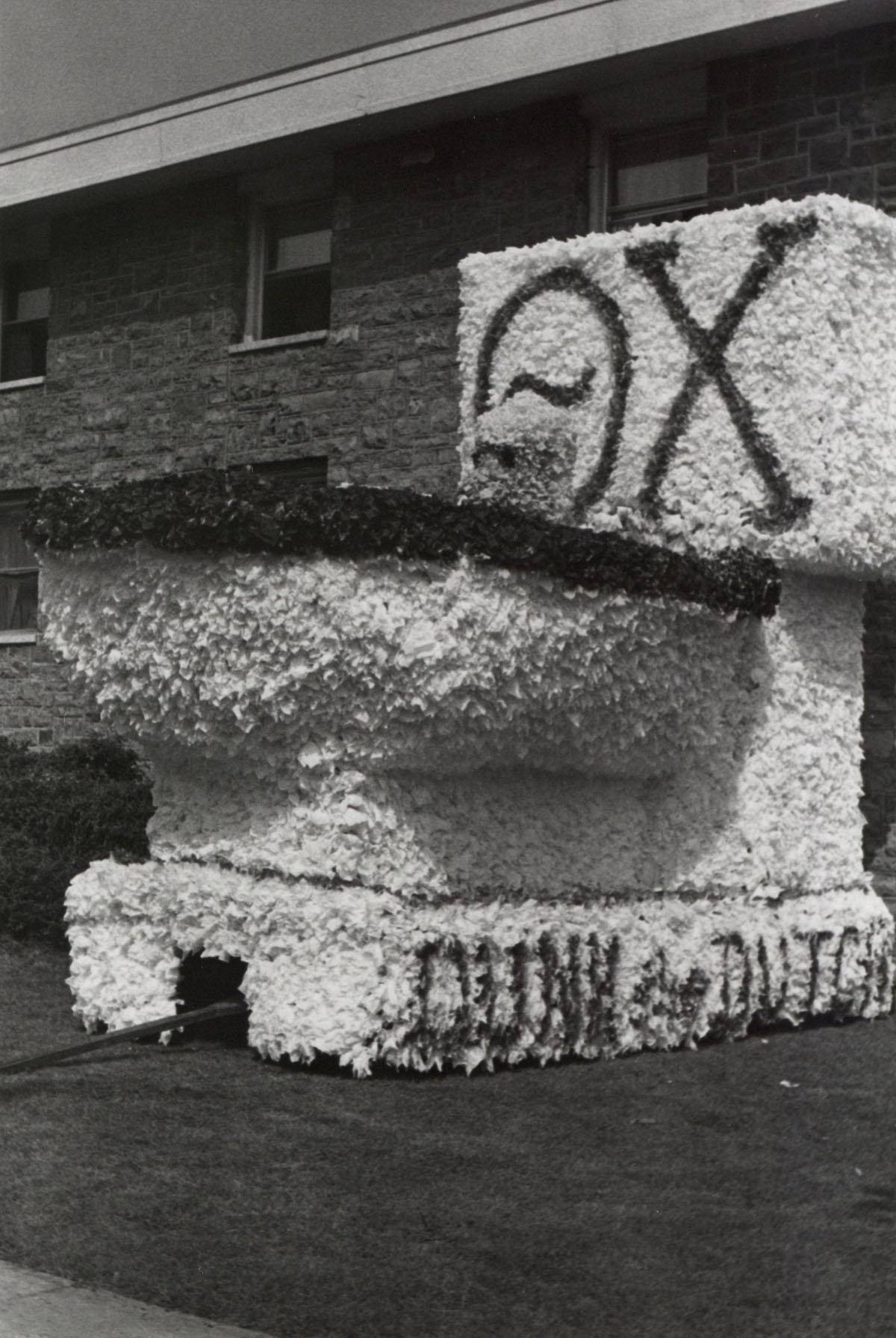 The Theta Chi fraternity creates this team spirit display for the Homecoming football game against Lebanon Valley in fall 1970. The display features a large toilet with the words "Dunk the Dutchmen" on the side.